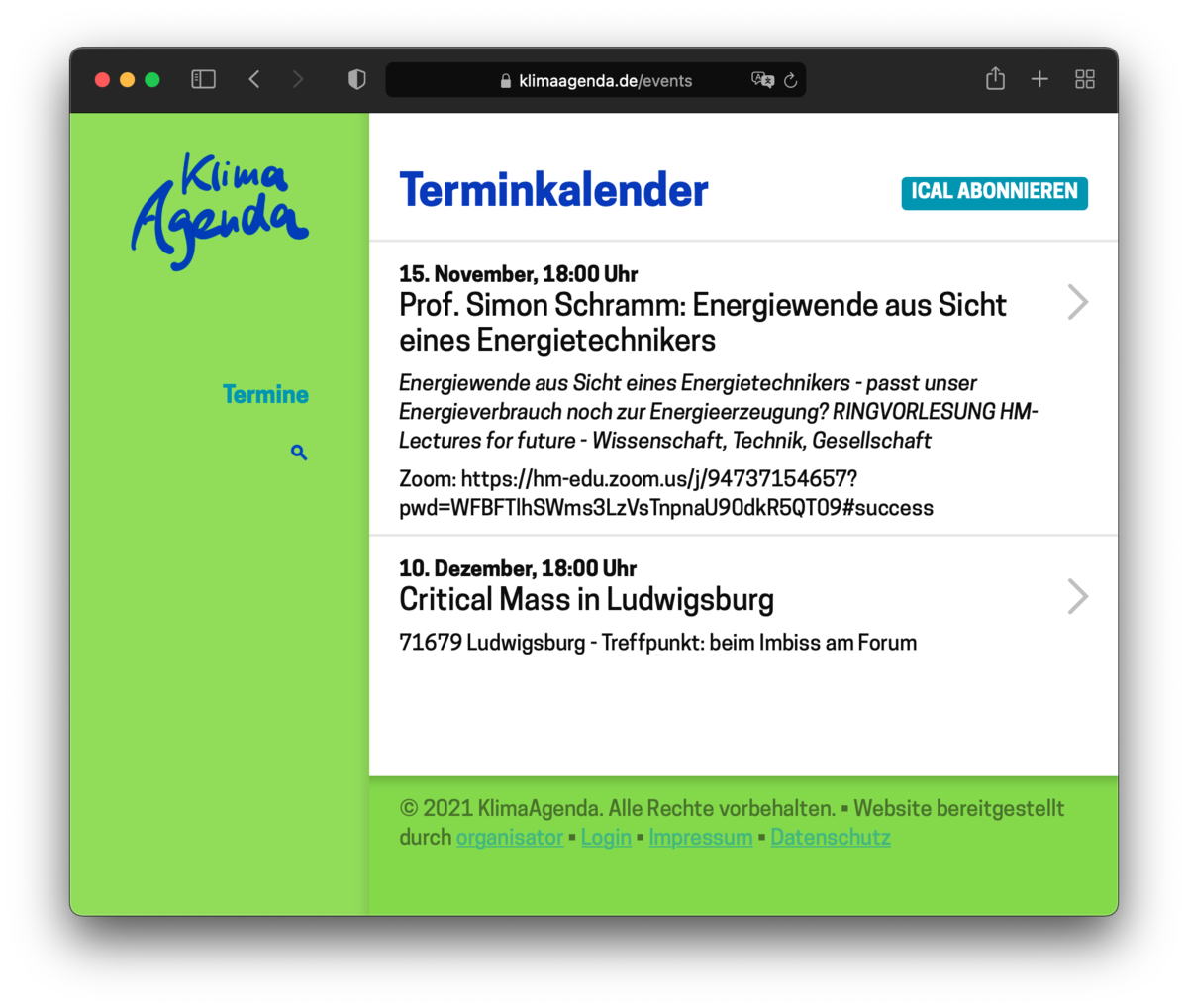 Jetzt kann man auch auf Websites, die die Open Source Community WebApp organisator nutzen, solche Kalendarien abonnieren und damit automatisch mit den veröffentlichten Termine informiert bleiben.