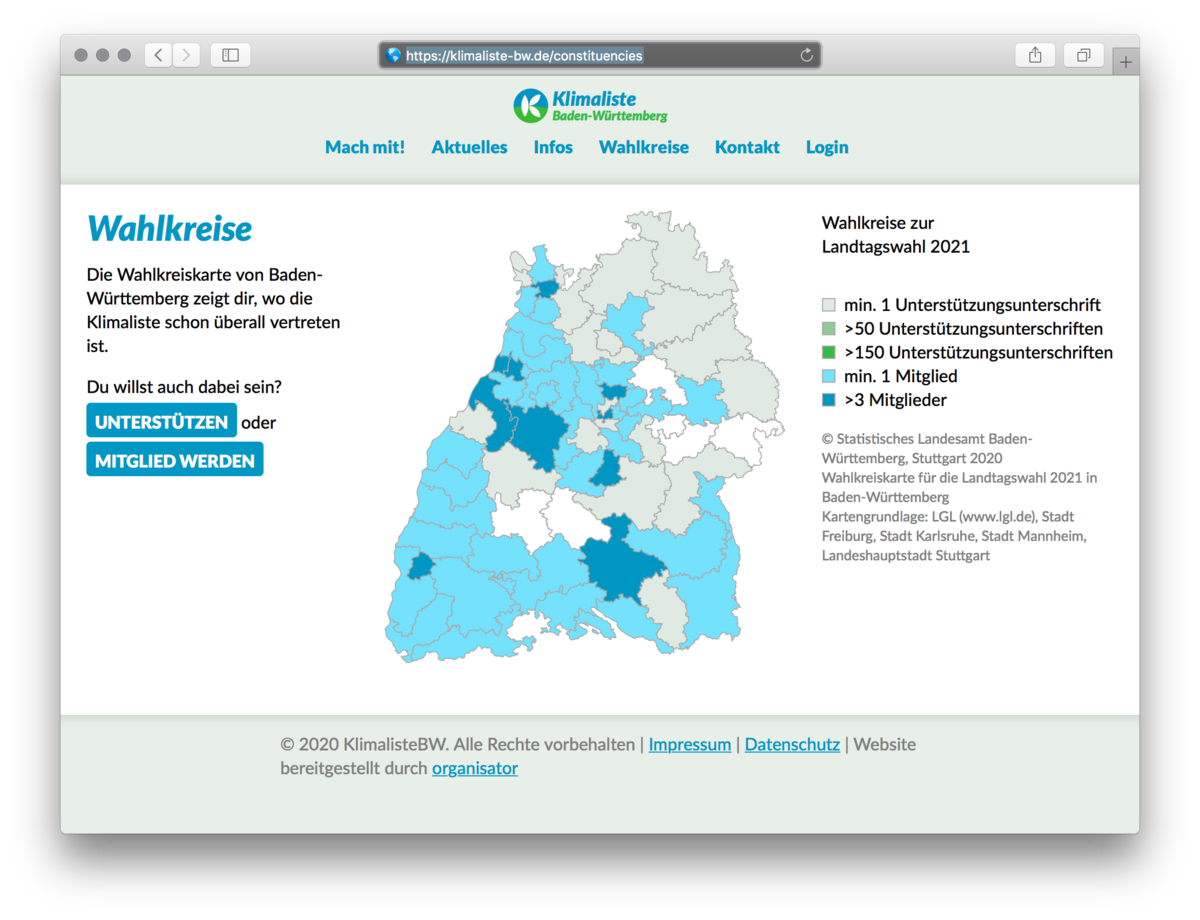 Website für die neue Landespartei KlimalisteBW mit Redaktionssystem, Mitgliederverwaltung, interaktiver Wahlkreiskarte und Kandidaturverzeichnis.